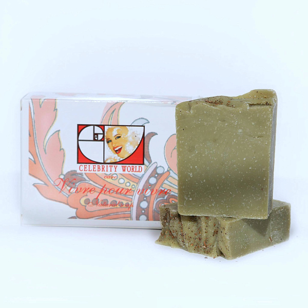 Натуральное мыло с большим количеством экстрактов цветов, трав, корней репейника, косточек красного виниграда, зелёного чая, питает, увлажняет и очищает.